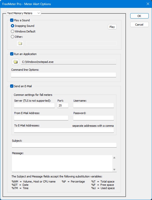 the Drive Space meter, Ping meter, CPU meters, and text physical memory meters. These screenshots are from FreeMeter